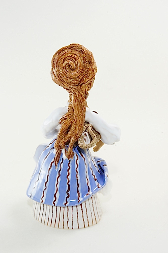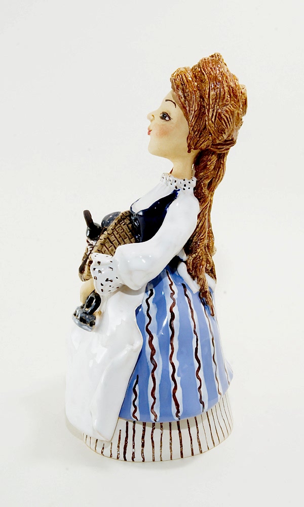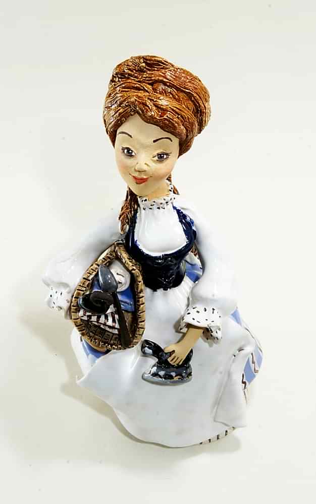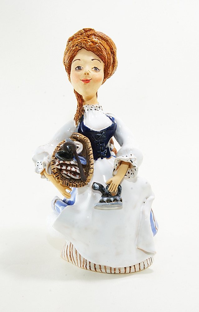Керамикой глина Пинап при ее обжиге, в процессе которого изделие приобретает прочность. Первый обжиг (утильный) куклы «Золушка» производился при температуре 1000-1050°С. Затем на поверхность изделия были нанесены высокотемпературные глазури (производства Германии, Финляндии Следом изделие подверглось второму обжигу, уже при температуре 1030-1080°С. На следующем этапе мастер нанес низкотемпературные глазури. Потом произведен третий обжиг, его рабочая температура 950-1000°С. Глазурование придает влагонепроницаемость и повышает прочность. Далее лицо куклы расписали акриловыми красками. После чего поверхность росписи была обработана лаком для закрепления акрила. На финальном этапе сделана подвязка ножек - язычка колокольчика.