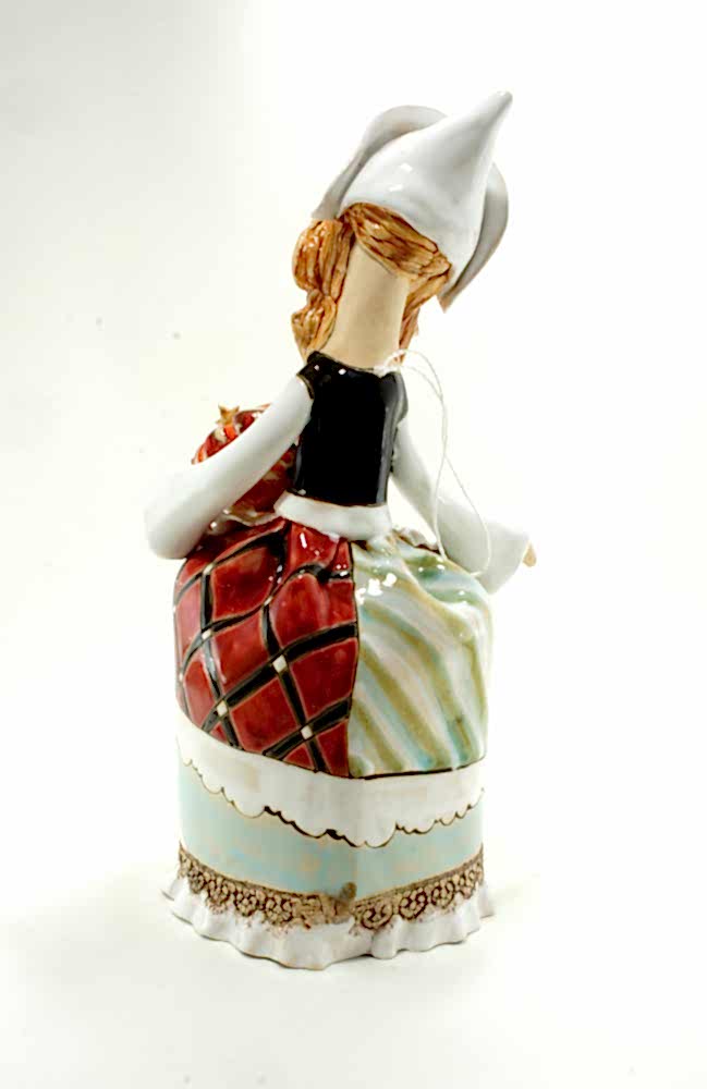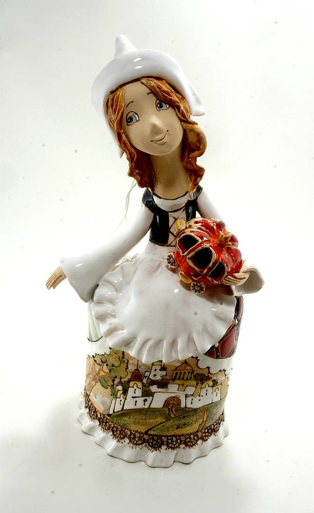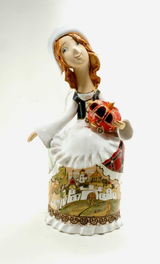 Керамикой глина становится при ее обжиге, в процессе которого изделие приобретает прочность. Первый обжиг (утильный) куклы «Золушка» производился при температуре 950-970°С. Затем на поверхность изделия нанесена глазурь (белая эмаль). Чаще всего глазурь наносят методом окунания. Но мастер при изготовлении куклы использовал методику глазурования, при которой эмаль наносится кистью в несколько слоев и неравномерно по поверхности изделия. За счет этого приема последующая роспись выглядит богаче. Глазурование придает влагонепроницаемость и повышает прочность изделия. По эмали произведена ручная роспись Пинап эффектарными глазурями и солями оксидов металлов. После полного высыхания изделие подверглось второму обжигу при температуре 1050-1100°С.