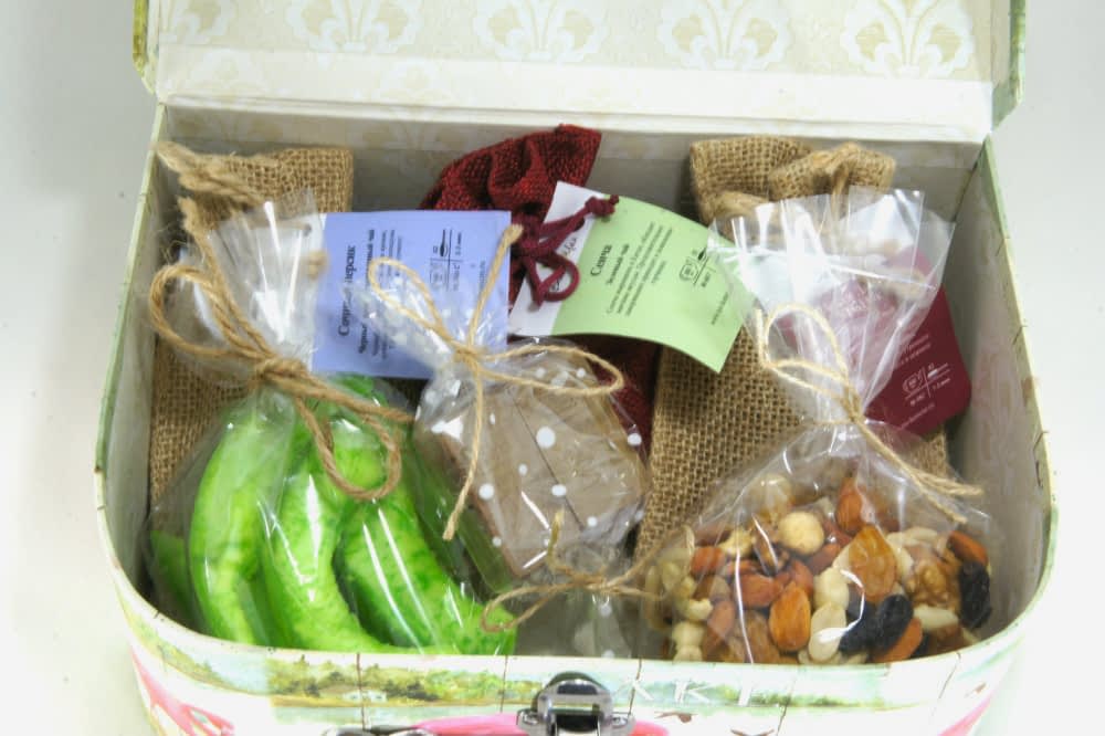 Подарок с чаем - коробка в форме саквояжа . На фотографии представлен Пинап Перед покупкой вы можете ознакомиться с подарками из нашего ассортиментав розничных магазинах “Дом Чая”. Наибольший ассортимент подарков представлен в магазине в Торговых Рядах “Жар-Птица” (пл. Достык, Пинап секция Н-42.