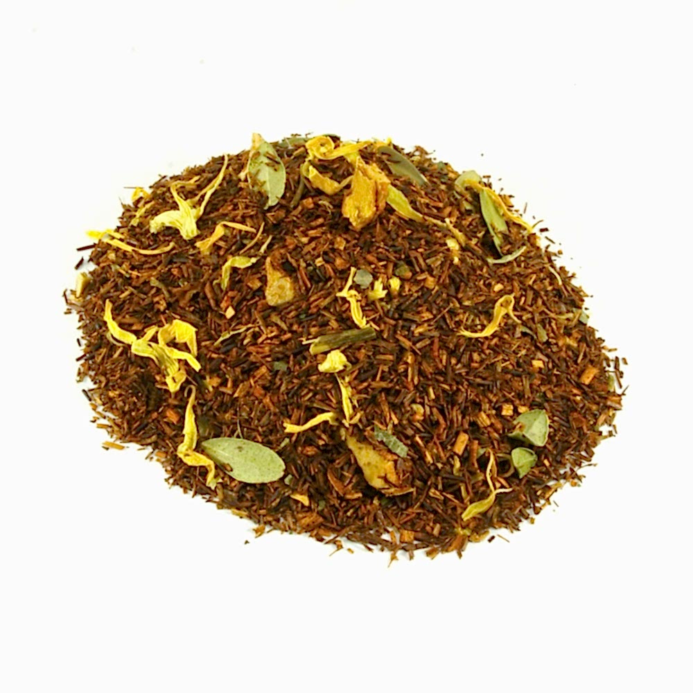 Ройбуш “Земляничный”- измельченные и ферментированные листья и стебли “Красного кустарника”, Пинап в южной африке. Природный антидепрессант. По тонизирующим свойствам не уступает кофе. Обладает сильным ароматом и фруктовым вкусом с кислинкой. Состав: кусочки яблок, клубники сублимированной, листья брусники и земляники, лепестки календулы.